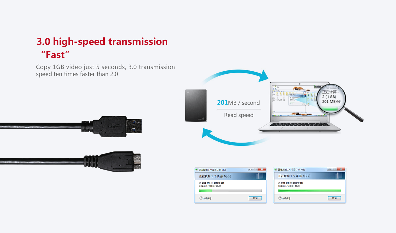 ● 1.USB3.0 transmission speeds of up to 5Gbps, downward compatible with USB2.0